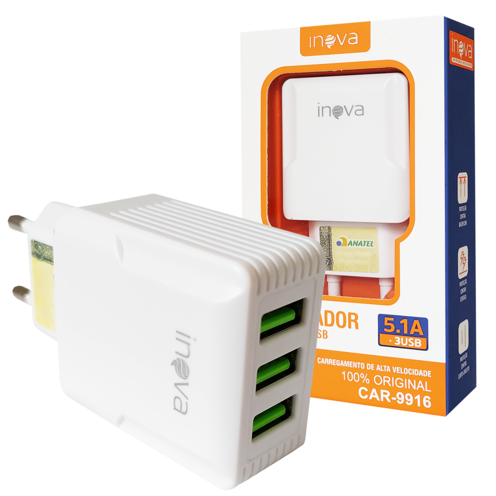 O Carregador Turbo Inova CAR-9916 oferece 5.1A de potência total e três portas USB, permitindo carregar até três dispositivos ao mesmo tempo com segurança e eficiência.